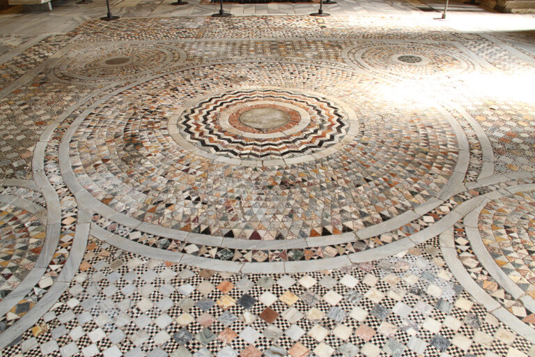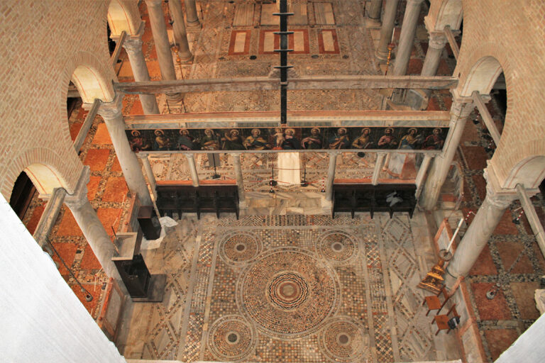 Thought to date to the 11th century, the mosaic floor of the presbytery in the Basilica of Santa Maria Assunta is in a very fragile state of conservation. Extending circa 900 square feet (85 sq.m) between the iconostasis and the high altar, it is composed of precious marble and stone tesserae in geometric designs.
