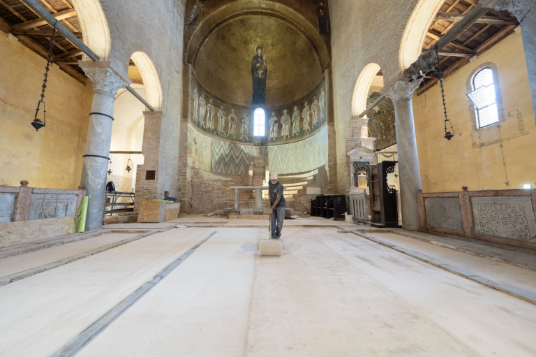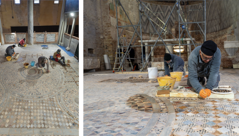 The conservation entails detaching the mosaic floor in sections, removing and replacing the mortar, integrating missing mosaic tesserae, and placing each section on a new base. The detached portions are being treated in a temporary laboratory set up in the closed fourth nave of the church. Once the roof work has been completed in 2025, the restored mosaic segments will be reinstalled in the presbytery, on top of a new subfloor that will be created following mosaic floor building practices defined by Vitruvio in the 1st century.
