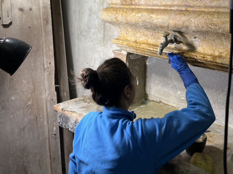 The lavabo showed signs of deterioration primarily due to its function and prolonged neglect. Limestone deposits inside the water-holding basin and around the faucet were carefully removed. Conservation treatment poultices were applied to the surfaces of the basin and pilasters, eliminating superficial degradation such as dust and grime that had altered the stone’s original tone. Additionally, many deteriorated or cement-filled joints between the various elements were restored to ensure structural integrity and aesthetic coherence.