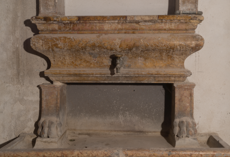 With its elegant and elongated structure composed of multiple stacked elements, this “lavabo da sacrestia” served priests in preparation for mass. The lowest component, a molded-edged basin, is supported by two wall-mounted shelves elevated about thirty centimeters above the ground. Resting atop these are two lion-paw pilasters that uphold a larger basin. Above this, two additional pilasters support an architrave and a full semicircular arch, crowned by a sphere positioned above the keystone.