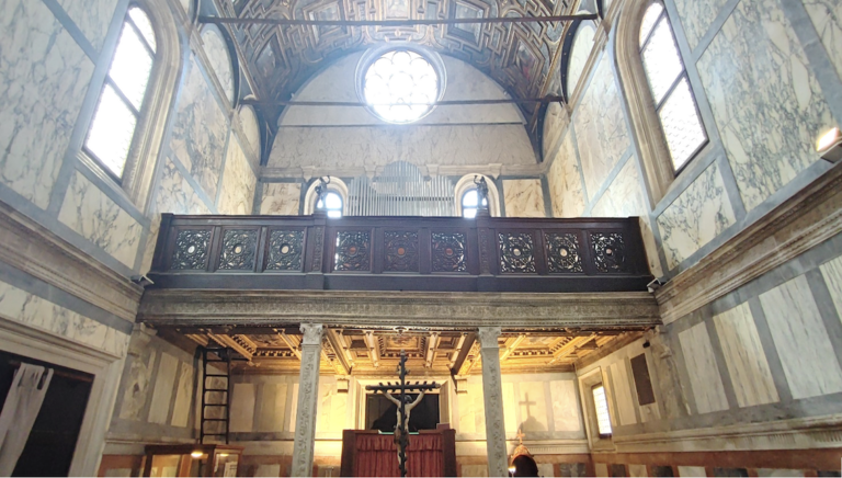 Between 1988 and 1998, Save Venice sponsored an extensive conservation program that encompassed the entire structure, safeguarding both its exterior and interior treasures. More recently, in the aftermath of the catastrophic acqua alta (exceptional high tide) of 2019, Save Venice once again intervened, funding urgent emergency treatments to stabilize the building and mitigate the immediate effects of flood damage.