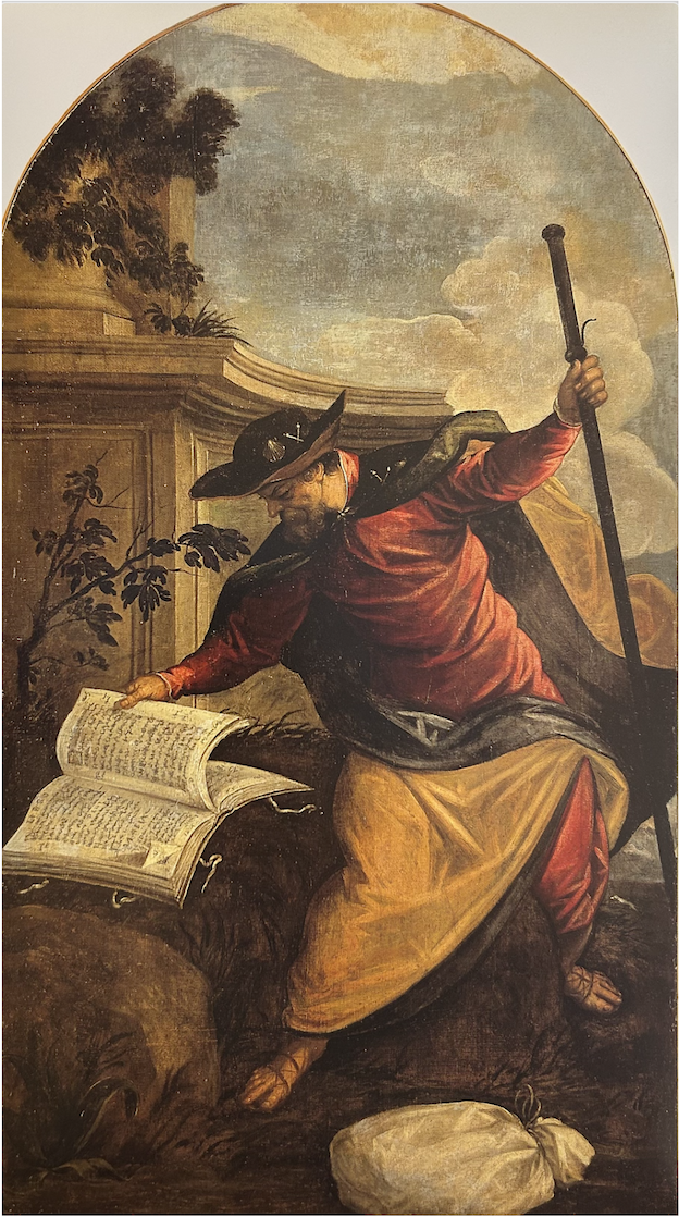 Aliense’s Saint James the Great stands among his most accomplished works, exemplifying his ability to synthesize the dominant artistic currents of the Venetian Renaissance. The composition demonstrates a refined synthesis of his master’s style and that of the most accomplished contemporary artists. The asymmetrical arrangement and inclusion of classical ruins recall the grand architectural backdrops favored by Paolo Veronese. At the same time, the dynamic, twisting pose of the saint’s body reflects the expressive energy characteristic of Jacopo Tintoretto’s figural style. Finally, the fluid, vigorous brushwork evokes the painterly technique of Jacopo Palma Giovane. In this painting, Aliense demonstrates not only his technical skill but also his capacity to reinterpret the visual language of the great masters of the time into a distinctive artistic voice.