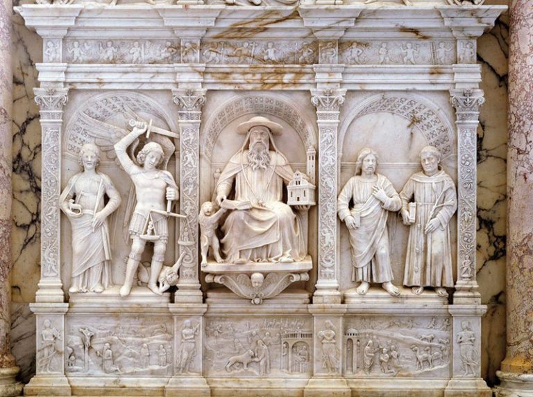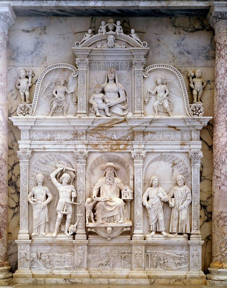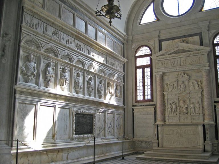 In the late fifteenth century, the wealthy Badoer family commissioned a carved choir screen for the church of San Francesco della Vigna, as well as a high-relief altarpiece for their family chapel. Both of these projects were most likely executed by Pietro, Tullio, and Antonio Lombardo and their workshop, with the possible assistance of Giambattista Bregno. In 1534, Jacopo Sansovino was commissioned to rebuild the church. Agnesina Badoer Giustinian, the Badoer heir who had married into the Giustinian family, asked Sansovino to incorporate the earlier Lombardo sculptural reliefs into the new Badoer-Giustinian Chapel, located off the transept to the left of the presbytery.
