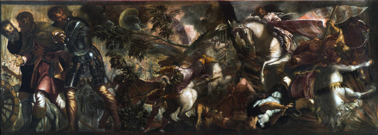 The three canvases were executed in two different phases: Saint Roch Healing the Animals was completed in 1567, whereas the Capture of Saint Roch at the Battle of Montpellier and Saint Roch in the Wilderness date to 1575-77. In the earliest of these works, Saint Roch offers his curative blessing to wild animals. The first among these is the lion, the symbol of Venice as if to affirm the Republic’s special protection by the saint. The scene of the Capture contrasts greatly with the bucolic Healing. Accused of being a spy, Saint Roch is arrested by soldiers and subsequently imprisoned. Tintoretto takes an inventive approach to depicting the event, imagining the capture as an unusually realistic battle scene, with hurtling bodies and horses tossed into the air by a violent explosion at the right. The third among these works, Saint Roch in the Wilderness, was primarily executed by Paolo Fiammingo, a Flemish artist then active in Tintoretto’s workshop and an expert in landscape painting. In the foreground, Saint Roch reclines in prayer as his faithful dog emerges from behind the hill on the right, carrying a loaf of bread in its mouth to feed the saint.