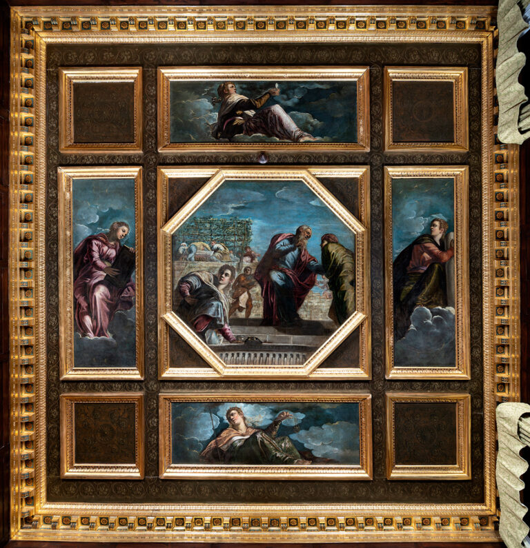The octagonal central ceiling canvas depicts The Return of the Prodigal Son, which recounts the moving story on the possibility of mercy, reconciliation, and redemption. This episode’s presence must have been intended to encourage criminals to repent and return to the good graces of the Venetian government. The scene is surrounded by four allegorical figures of the virtues Faith, Justice, Fortitude, and Morality, which were designed by Jacopo but largely executed by his workshop.