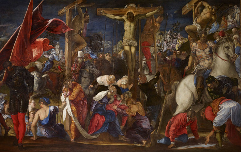 At the apex of this chaotic scene, Christ-on-the-Cross is illuminated at top-center with a glowing halo, and his body appears more noticeably at peace in contrast with the other figures. A subtly rendered spear wound on Christ’s torso intimates that he is already dead, which is further confirmed by the figure of Mary at the base of the Cross, who has fainted and is being held up by her companions. Tintoretto includes references to other events surrounding the episode of the Crucifixion as well, such as the Roman soldiers casting lots for Christ’s tunic in the right foreground. Out of the background’s darkness, the artist masterfully uses light to highlight not just the figure of Christ but also one of the two thieves on the cross as well as the centurion, who are both saved after declaring Christ the Son of God.