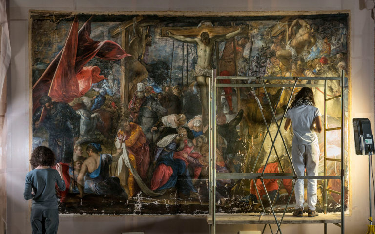 This large painting (over 14 feet wide by over 9 feet tall), was last restored in the 1940s and again in 1966 as it continued to show signs of conservation problems. Indeed, 50 years later, this canvas underwent conservation treatment to address many signs of deterioration, including several large areas of cracking and flaking paint that threatened permanent loss to the work. Severely altered areas of heavy retouchings from various restoration treatments combined with the effects of darkened surface varnishes had distorted the quality of this painting, rendering some sections nearly illegible to museum visitors. Thanks to the diligent efforts of conservator Barbara Ferriani and her team, Tintoretto’s vibrant color palette is once again visible and the painted surface has been safeguarded from future losses.