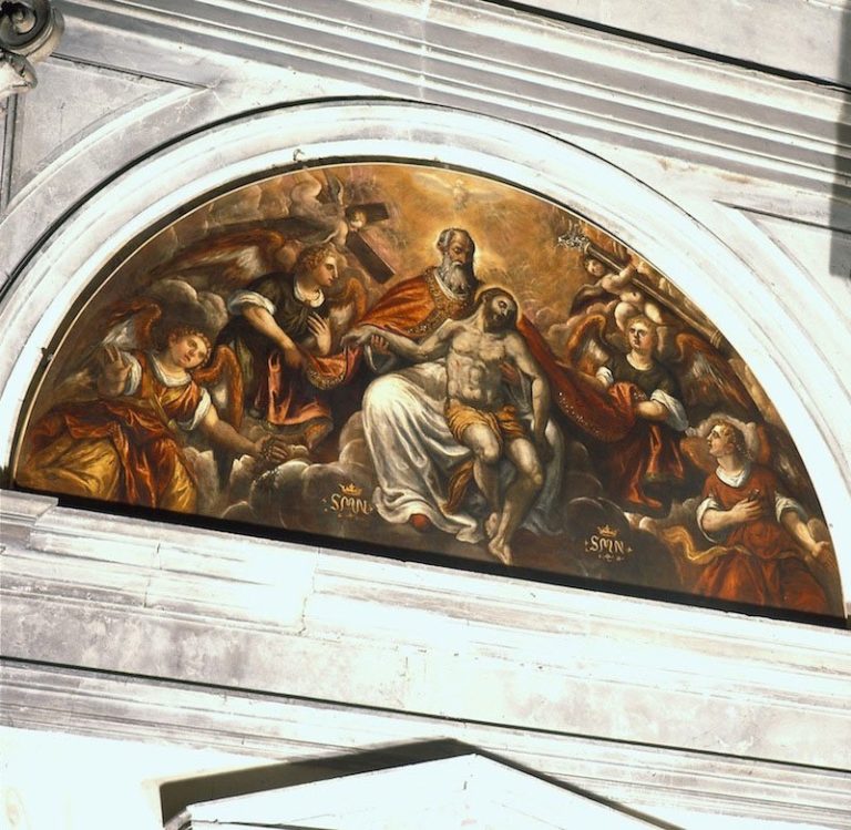 This lunette painting, semi-circular in shape, is located above Francesco Fontebasso’s altarpiece of Saints Leonard, Lorenzo Giustinian, Andrew, and Nicholas of Bari in the church of San Salvador. It has been attributed to Girolamo Pilotti, a pupil of Palma il Giovane, who had been active at San Salvador around 1600.