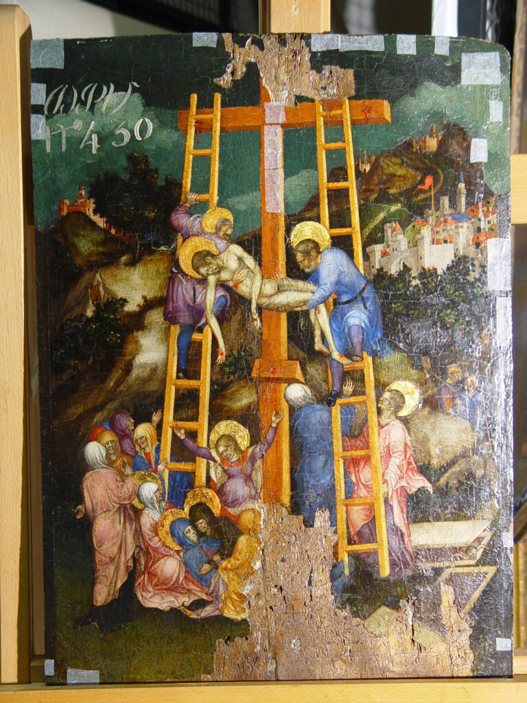 This small panel painting depicting the removal of the body of Christ from the cross was previously relegated to storage due to its poor condition. It was restored in time to be featured in the 2016 Accademia exhibition dedicated to the artist: Il Paradiso riconquistato. Trame d’oro e colore nella pittura di Michele Giambono.