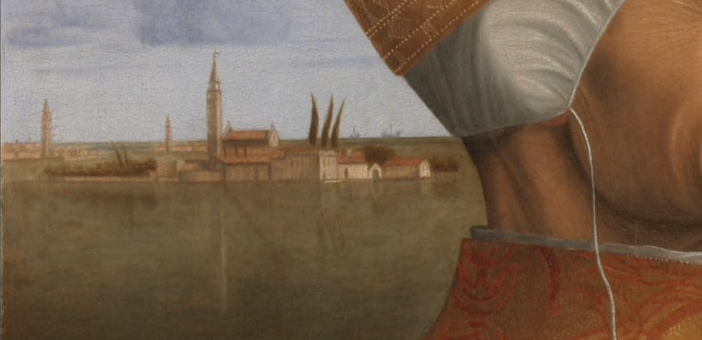 The astonishingly high degree of finish has previously led critics to attribute the work to some of the most illustrious painters of the early Renaissance in Venice, including Gentile Bellini and Vincenzo Catena. But scholars now agree that the evidence points most strongly to Vittore Carpaccio. First and foremost, the treatment of the clothing and headgear of the doge, upon which the weave of the fabrics reflect the light in infinite dots of gold, is identical to that in some of the garments worn by Ursula and her companions in the Cycle of Saint Ursula, whose restoration was completed by Save Venice in 2019. Moreover, the view of the Island of San Giorgio recalls that in the upper right portion of the Lion of Saint Mark, restored by Save Venice in 2021, and employs a similar atmospheric treatment to that of Carpaccio’s Hunting on the Lagoon at the Getty Museum.