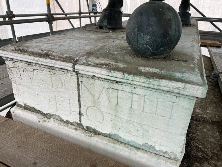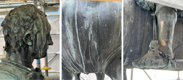 The statue suffers from ‘bronze disease,’ a form of corrosion that affects copper alloys. In this process, cuprous chloride reacts with water to form hydrochloric acid, which attacks and corrodes the bronze in its turn, thus speeding up the copper’s deterioration. Possibly on account of the difficulties involved in casting an equestrian statue of this size, Donatello split the monument into 36 pieces, thus increasing the structural instability of both the horse and its rider. The base, in trachyte and Istria stone, has also deteriorated due both to its constant exposure to the elements and to the corrosion of the cement mortar applied during an earlier restoration. Beginning in autumn 2025, comprehensive studies are taking place to determine the full extent of decay present in the monument in order to determine the best way to preserve the ensemble.