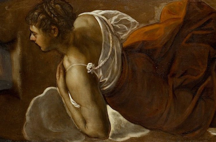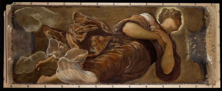 Surrounding his central painting of Saint Roch in Glory in the Sala dell’Albergo, Tintoretto added allegorical representations of the other major Venetian Scuole Grandi, as well as personifications of the virtues and seasons, as well as female figures. The two Female Figures in Flight are particularly striking for the rendering of their rich draperies, which flutter in the wind. The paintings were executed with the help of Tintoretto’s workshop assistants, and likely offered without charge following the Scuola’s acceptance of the central painting.