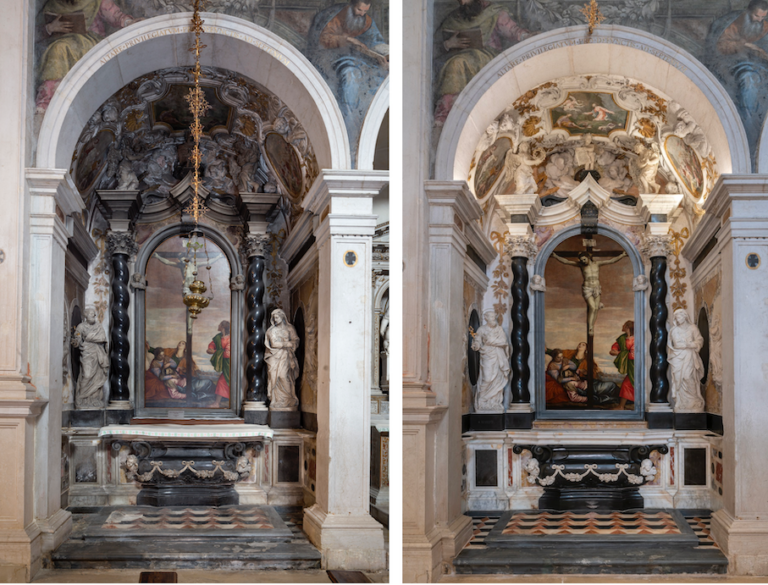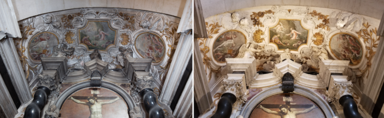 Prior to treatment that began in January 2019, the Garzoni Chapel was in the most perilous state of conservation of all of the chapels due to the effects of rising damp and salt deposits. The corrosive salt threatened the permanent loss of many details on the precious marble sheeting on the walls. The elaborate early 18th-century stucco decorations in the vault of the chapel were completely obscured by a thick layer of surface grime and several small pieces had become detached and risked falling off completely.