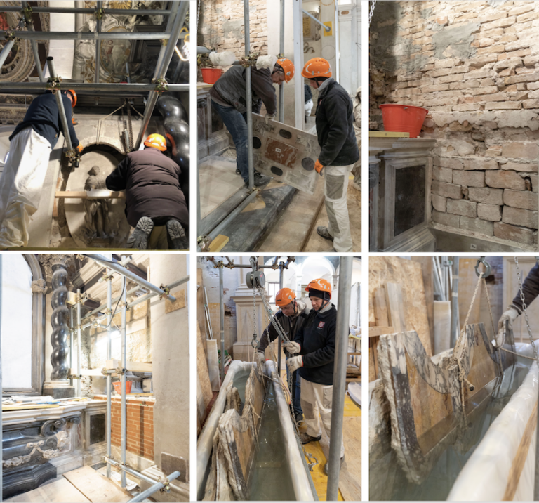 Treatment first began with a comprehensive desalination cycle of the marble elements on the walls of the chapel. These pieces were carefully dismantled and emerged in baths of de-ionized water for several weeks in order to remove the embedded salts inside the marble. The heavily deteriorated side brick walls of the chapel were also replaced. The stuccowork and frescoes on the vault of the ceiling were cleaned in situ, removing centuries of dirt and grime, and revealing the original bright colors. The black and white marble of the altar and frame were also cleaned.