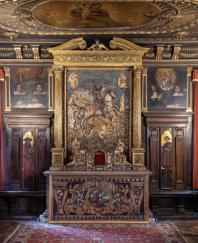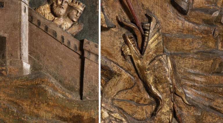 This remarkable altarpiece not only celebrates the patron saints of the Scuola Dalmata—Saint George, Saint Tryphon, and Saint Jerome—but also stands as a lasting testament to the confraternity’s enduring identity. At its center is a rounded polychrome wooden low relief, enriched with gilding, depicting Saint George Fighting the Dragon—by far the most accomplished element of the ensemble. Attributed to Giacomo Moranzon, a member of the bets workshop of woodcarvers in fifteenth-century Venice, the panel unites virtuoso carving with delicate painting to produce a highly refined image that integrates Christian iconography with the language of courtly imagery.