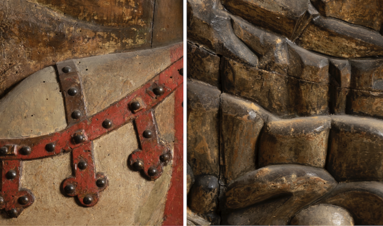The conservation plan involves a biocidal treatment to eliminate an active infestation of wood-boring insects, as evidenced by exit holes on the horse and accumulations of wood dust. Structural stabilization will be achieved by consolidating panel joints and the connections between the architectural elements of the frame, and by securing areas where lifting has occurred. This will be followed by careful surface cleaning and the reintegration of altered pictorial retouches from earlier interventions, carried out in accordance with the existing chromatic and material conditions. The process will conclude with the application of a protective final varnish, designed to ensure long-term preservation while safeguarding the integrity of the polychrome surface.