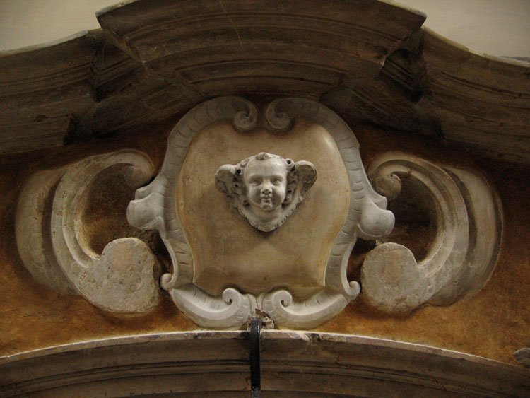 The altar dates to the church’s eighteenth century reconstruction, and is the work of an unidentified Venetian sculptor in the transition period from Rococo to Neoclassicism. The sculptural angels that adorn the altar are particularly impressive in their execution, from the fine detail in the feathers of their wings to the expressive folds of their draperies.