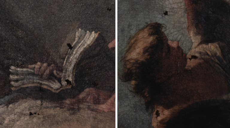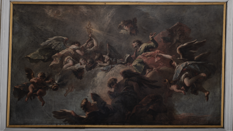 The painting is obscured by a thick layer of non-original surface residues, including grime, dust, darkened oxidized varnish, and unsightly areas of chromatically altered overpainting from previous restorations. These layers will be carefully thinned and removed. Additionally, the canvas exhibits areas of paint loss, which will require integration using reversible conservation paints. Once the canvas is taken down from the church’s ceiling, its structural integrity and tension will be assessed. If necessary, conservation measures such as strip lining and stretcher replacement will be considered to ensure its long-term stability.