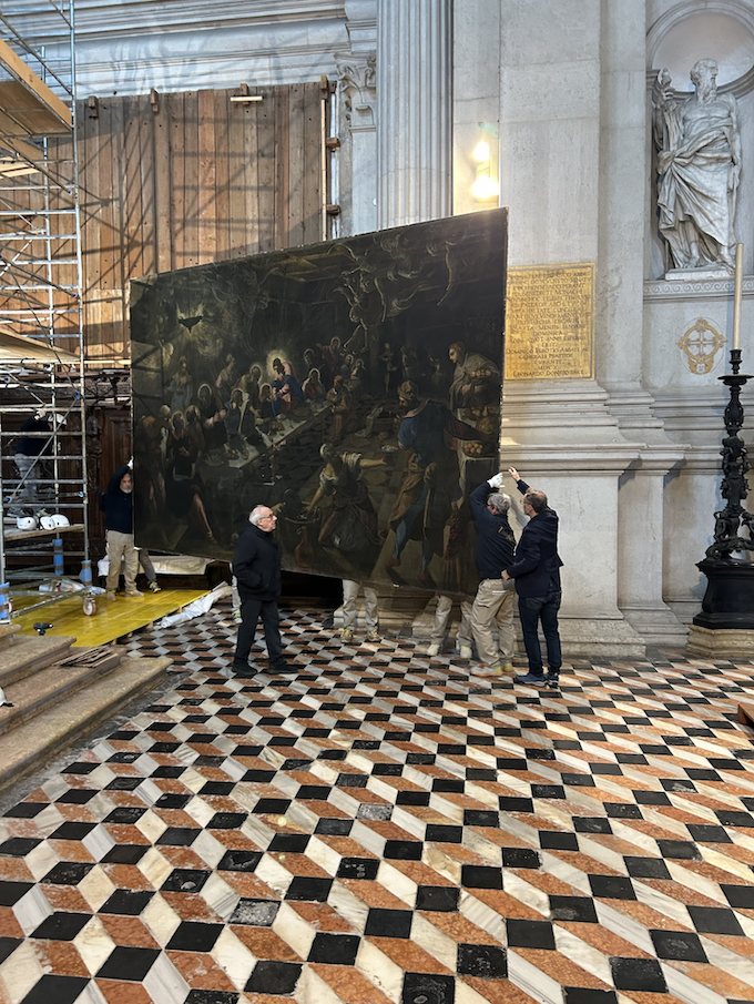 Jacopo Tintoretto’s Last Supper in the prestigious Benedictine monastery church of San Giorgio Maggiore represents the painter’s artistic legacy, the extreme result of a subject whose formal and thematic ideas he explored for almost half a century. This extraordinary canvas was likely commissioned by the monastery’s abbot Michele Alabardi, and together with The Israelites in the Desert still decorates the presbytery’s side walls. Tintoretto painted these two large canvases around 1591 and 1592, just before dying in 1594. At San Giorgio Maggiore, Tintoretto also made his last painting—the Entombment of Christ for the Cappella dei Morti, an altarpiece Save Venice restored in 2020.