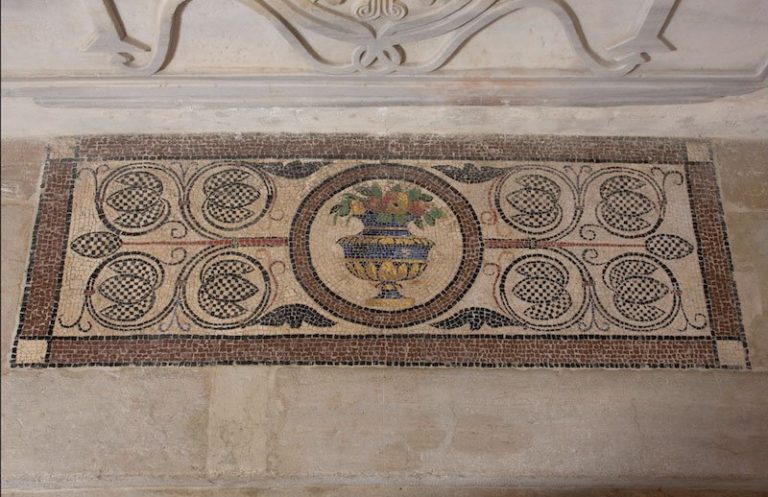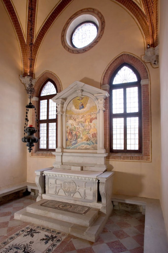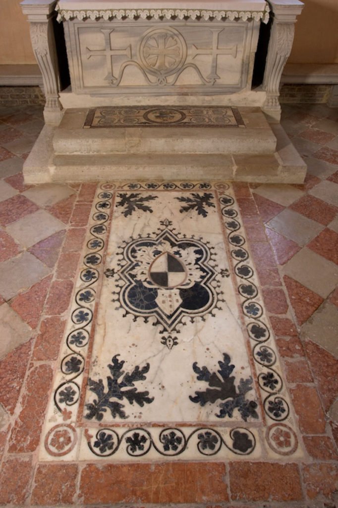 The oldest work of art in the chapel is the decorative Roman mosaic embedded in the floor immediately in front of the altar. The carved altar front with a fluted cross, surrounded by a wreath and flanked by two other crosses, dates from the thirteenth century. The mosaic altarpiece, depicting the Madonna and All Saints and signed and dated by Arminio Zuccato in 1575, was executed after a design drawn by Jacopo Tintoretto. On the floor of the chapel is the tomb of Bishop Marco Lando. Although he died in the fifteenth century, the decorative cover of his tomb, with inlaid marble and the Lando coat of arms, was not completed until the following century.
