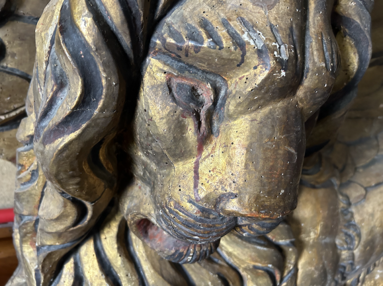 The wooden sculpture exhibited significant damage, including evidence of a past infestation by wood-boring insects, cracks, paint loss, and flaking. The entire body of the lion was coated with a thick layer of dirt and grime, along with deteriorated inpainting and varnish likely applied in the 1950s when the sculpture was moved to the library. During this previous treatment, clumsy dark lines were added, overly accentuating the feathering of the wings, the curly mane, and the lion’s facial features. Furthermore, the red paint outlining the lion’s eyes was so carelessly applied that it left streaks and drips, giving the appearance of improbable tears. Save Venice’s conservation treatment addressed all these issues, ensuring the structural stability of the sculpture and removing the non-original coatings to restore the artwork’s original appearance.