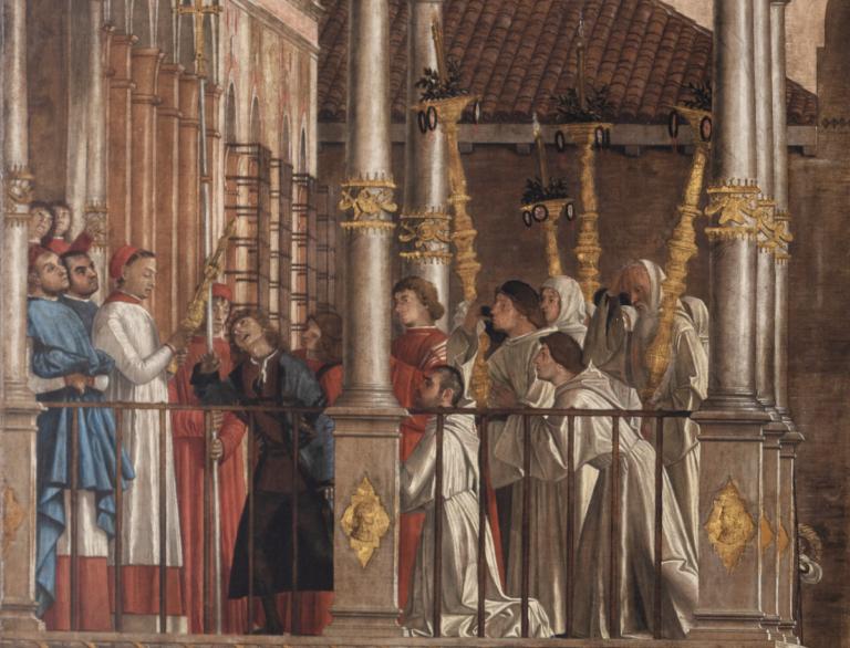 Between 1494 and 1505/10, the Scuola Grande di San Giovanni Evangelista, a confraternity dedicated to Saint John the Evangelist, commissioned a series of large narrative paintings known as the Cycle of the True Cross. The paintings illustrate the miracles associated with the confraternity’s most precious relic, a fragment of the True Cross donated to the Scuola in 1369 by Philippe de Mézières, former Chancellor of the Kingdom of Cyprus. The canvases, painted by Gentile Bellini, Vittore Carpaccio, Lazzaro Bastiani, Giovanni Manseuti, Benedetto Diana, and Pietro Perugino (lost) remained in the Scuola’s Oratory of the Cross until 1806, when they were removed during the Napoleonic suppressions. The paintings were transferred to Venice’s Accademia Galleries on 4 July 1820, and are currently housed in a room adjacent to Carpaccio’s Saint Ursula Cycle, whose conservation Save Venice completed in 2019. In the same year, Save Venice also funded the creation of the Virtual Reconstruction of the Oratory, which offers visitors an immersive tour of the room as it looked in the 16th century.