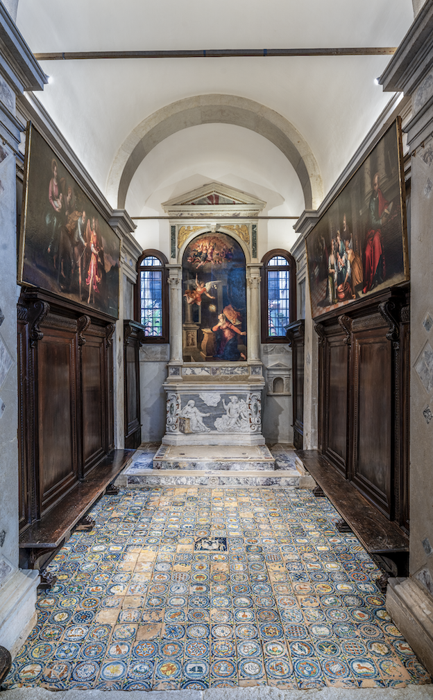 The Chapel of the Virgin Annunciate, also known as the Lando Chapel, is located in the church of San Sebastiano, to the left of the presbytery and just a few feet away from Paolo Veronese’s tomb. Marco Lando, the grandson of Girolamo Lando, the Patriarch of Constantinople, acquired the chapel on March 1st, 1531. The chapel was transferred as a dowry to Marco’s daughter, Bianca, when she married Daniele Vitturi in 1542 and remained on the property of the Vitturi family until the relatives of doge Carlo Ruzzini took it over. The chapel was once known for its colorful majolica tile floor dating to 1510 and installed on the chapel floor by the Lando family between 1531 and 1542.