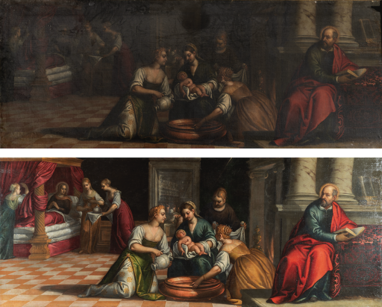 Each painting in the Virgin Annunciate (Lando) Chapel was covered with a thick layer of surface dirt and grime, as well as oxidized varnish, obstructing the original details and colors. During conservation treatment, these non-original layers were carefully thinned and removed, together with any heavy overpainting from previous restoration attempts. Any losses to the pictorial surface was filled using removable conservation paints before a final layer of protective varnish was applied. The cleaning process revealed that the altarpiece depicting the Annunciation was not painted by Matteo Ingoli, as previously thought.