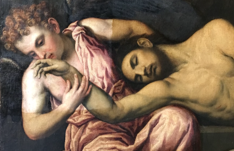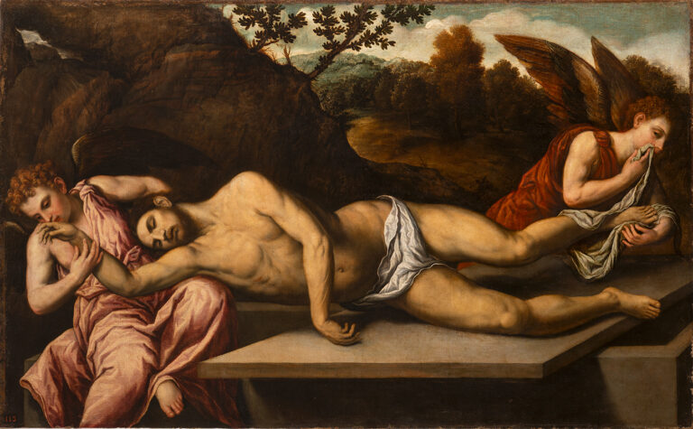 Some believe that Bordone painted this canvas for the Canececchi family in Treviso, where in 1648 Marco Boschini described seeing “a dead Christ with two angels holding him.” However, it should be noted that Bordone’s composition was quite popular, and at least two replicas by his assistants are known to exist: one formerly in the Gaggia Collection in Venice, and another at the Moravská Galerie in Brno dating to c. 1545-1555. Although the painting’s original provenance remains uncertain, its authorship is confirmed by Bordone’s body of work. Notably, his Mars and Venus Surprised by Vulcan, created between 1548 and 1551 and housed at the Staatliche Museen in Berlin, and the Sleeping Venus at the Galleria Borghese in Rome, dated to the late 1550s, provide strong stylistic parallels. This comparative analysis implies a dating for the Deposed Christ Supported by Angels in the 1550s.