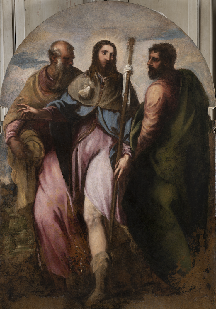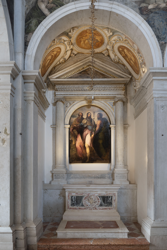 On 24 June 1557, the chapel’s patronage shifted to Vincenzo Pellegrini, a renowned orator and jurist of Dalmatia origins, praised by poet Ludovico Dolce as “orator clarissimo” (1562). Pellegrini commissioned from artist Andrea Meldolla, known as Schiavone, the frescoes of the chapel’s vault and the altarpiece portraying Christ in the guise of a pilgrim, accompanied by two disciples traveling the road to Emmaus. While drawing inspiration from the Gospel story of the Resurrected Christ’s appearance in Emmaus, the iconography of this painting is remarkably unconventional. Typically, artists would depict Jesus revealing his true identity while dining at the table with the two pilgrims. Schiavone, on the other hand, made a distinct choice by opting for an earlier passage from the Gospel: “he appeared in another form to two of them walking along on their way to the country” (Mark 16:12). This choice was evidently a tribute to the patron’s surname, Pellegrini.
