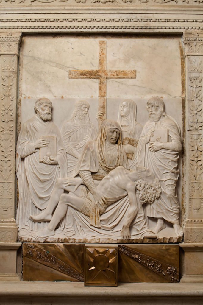 This marble relief of the Pietà with Saints by Tullio Lombardo, the elder son of Pietro Lombardo, is still in its original location: it is installed above the altar of the Gussoni Chapel in the church of San Lio. The portrayal of this sorrowful subject, in which the Virgin Mary holds the body of her dead son, is particularly expressive and dramatic. Surrounded by Saints Nicholas of Bari, Andrew (?), Helena, and James, the Virgin Mary holds Jesus’ lifeless body and looks down at him with her brow furrowed and her mouth open, as though releasing an anguished cry or a sigh of despair. The body of Christ, head falling backward and over Mary’s knee, seems to be slipping from her grasp and off of her lap.