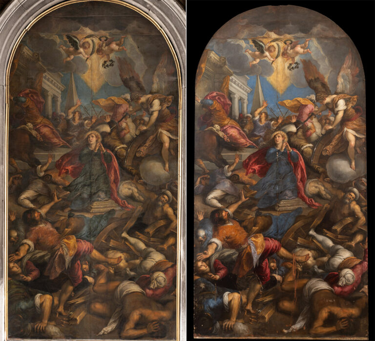 The brilliant colors of the artist’s palette had been distorted by thick layers of darkened varnishes and chromatically altered overpainting from previous interventions. Conservator Giulio Bono and his team meticulously thinned and removed these non-original surface layers and residues with innovative solvents. Small losses to the pictorial surface were filled and integrated with removable conservation paint, and a final coat of protective varnish was applied as the last step in the process.