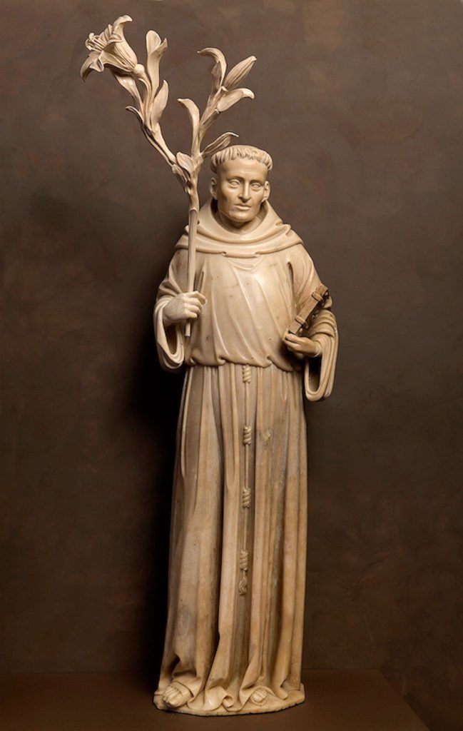 The original location of these sculptures in the church of Santo Stefano is unknown, but they must have been installed inside a niche or directly against a wall because the back of each sculpture is unfinished. Saint John the Baptist, barefoot and wearing a cape over his traditional animal-hair tunic, points to his prophetic scroll preaching the coming of the Lamb of God. The Franciscan Saint Anthony of Padua holds in his left hand the book of the word of God; his right hand may have originally held a lily similar to the later one that he currently holds, which became his traditional attribute.