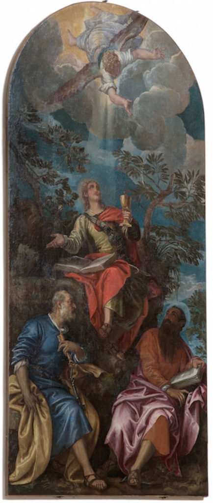 At the center of the canvas, Saint John the Evangelist looks upward at an angel who appears from the heavens. Accompanied by his symbolic beast, the eagle, the saint holds his open Gospel on his lap and a chalice in one hand that contains a snake — a reference to an episode from the life of Saint John, in which he was given a cup of poisoned wine that he blessed, transforming the poison into a snake that then emerged from the cup. On the ground below him, Saint Paul holds his book of Epistles on the right, while Saint Peter clasps the keys to the Church on the left. Although he is not the central figure, Peter’s presence in the picture is prominent, appropriately so for a painting housed in a church that was not only dedicated to him, but which also served as the cathedral of Venice.