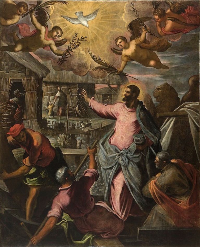 In Saint Mark Blessing the Origins of Venice, Saint Mark stands in a boat in the act of blessing the site where four centuries later, in the year 421, the descendants of the hut-dwellers depicted in the painting would found Venice, and where Mark envisions his body will come to rest. The words of his vision would be adopted as the Venetian motto Pax Tibi Marce Evangelista Meus (Peace be with you, Mark, my Evangelist), frequently represented on the open book held by the winged lion, symbol of Saint Mark.
