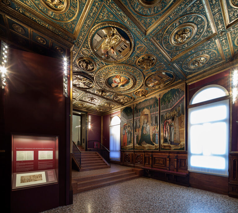 The Sala dell’Albergo, now Room XXIV of the Gallerie dell’Accademia, was originally the boardroom of the Scuola Grande di Santa Maria della Carità, one of the most powerful charitable confraternities in Venice. The officers of the Carità confraternity held their meetings in this richly decorated room and an upstairs space reached via a fifteenth-century wooden spiral staircase, also once kept the Scuola’s registers, statutes, and reliquaries.