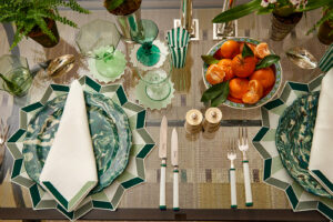 The collection recalls memories of Venice with linen placemats inspired by the floors of the Gallerie dell’Accademia and water glasses, pitchers, and candlesticks crafted exclusively for @modaoperandi by traditional Murano Glass master, David Fuin. This elegant collection features four distinct color stories to choose from and fully encapsulates the distinct traditions and talents of Venice and its artisans.