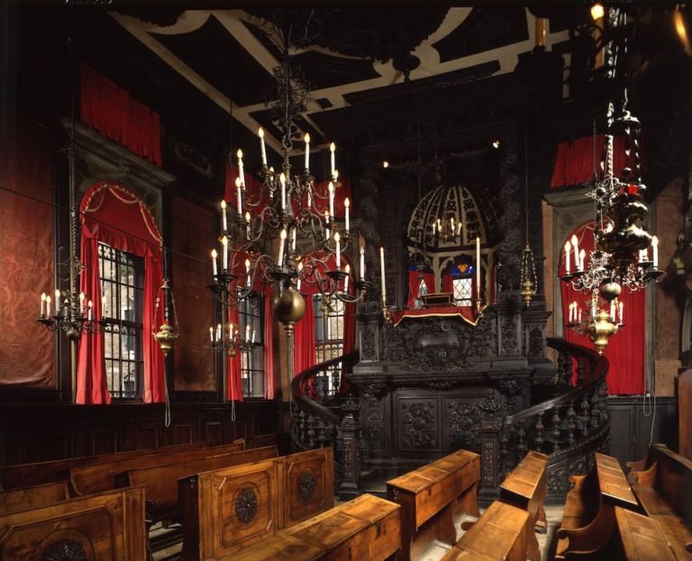 The interior of the Scuola Levantina, the synagogue built in 1689 by the Sephardic community in Venice, is noted for its finely carved woodwork, traditionally attributed to Andrea Brustolon (1662–1732) and his atelier.