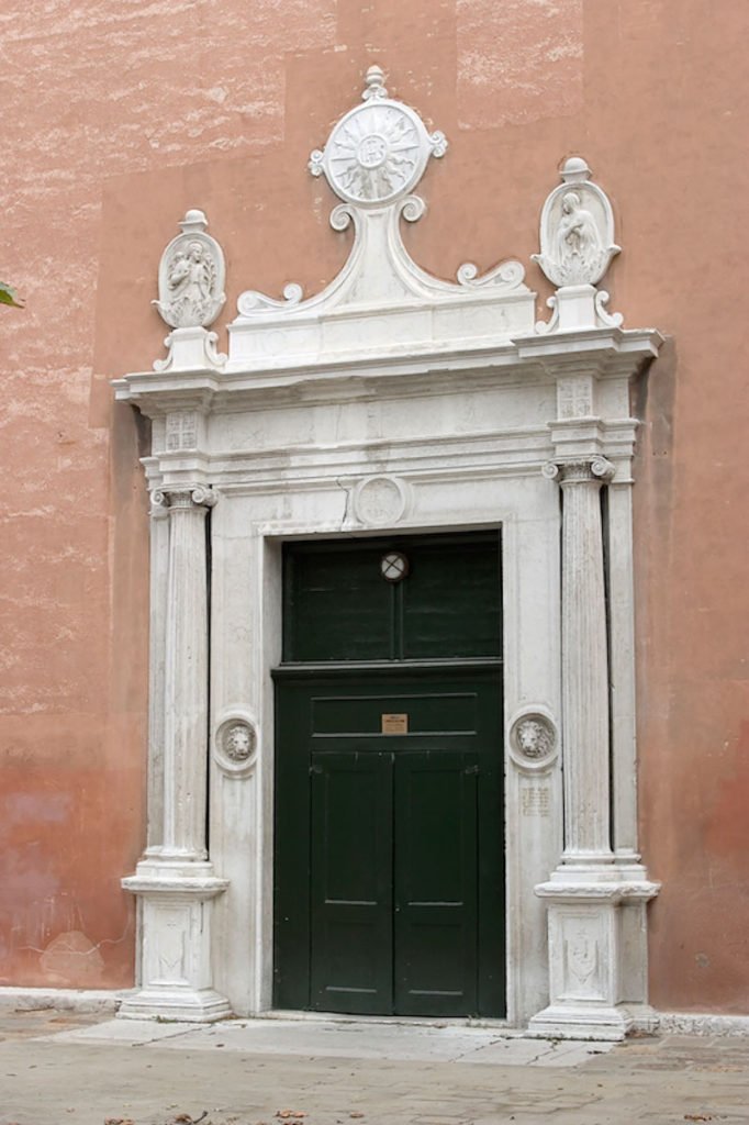 Three stone reliefs, encased in roundels, are located above the doorway. The first contains the letters IHS (the abbreviation of the name Jesus in Greek) in a disk surrounded by flames; this is the symbol of San Bernardino, a canonized Franciscan friar from Siena who also preached in Venice. The remaining reliefs depict the Archangel Gabriel and the Virgin Mary in a scene of the Annunciation. The frieze above the doorway is decorated with a central cross, and Jerusalem crosses appear above the two side columns. The Jerusalem cross was first used as a coat of arms for the Latin kingdom in Jerusalem. During the Crusades it was referred to as as the Crusader’s cross, the symbol of a Christian warrior. It is composed of four small crosses surrounding one large cross. Two Istrian stone lion heads, set in roundels, decorate the doorway’s pilasters. The Trevisan and Marcello coats of arms decorate the pedestals of the doorway columns.