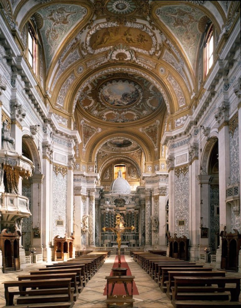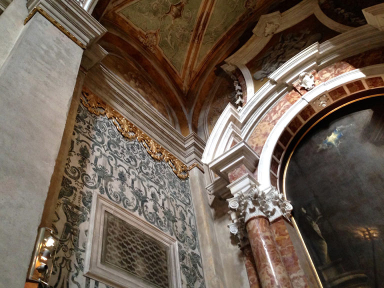 Several churches had existed on this site in Cannaregio, but they were either destroyed by fire or demolished. Around 1715 the Jesuits commissioned the church of Santa Maria Assunta that still stands there today; it is commonly known as the Gesuiti. The design of the church is credited to architect Domenico Rossi, and a significant portion of the project was financed by the Manin, a wealthy family of the Venetian nobility. The church’s interior columns, pilasters, and cornices are richly decorated with inlaid green and white marble, designed and draped to look like damask. The floor is paved with an elaborate design in black and white marble.