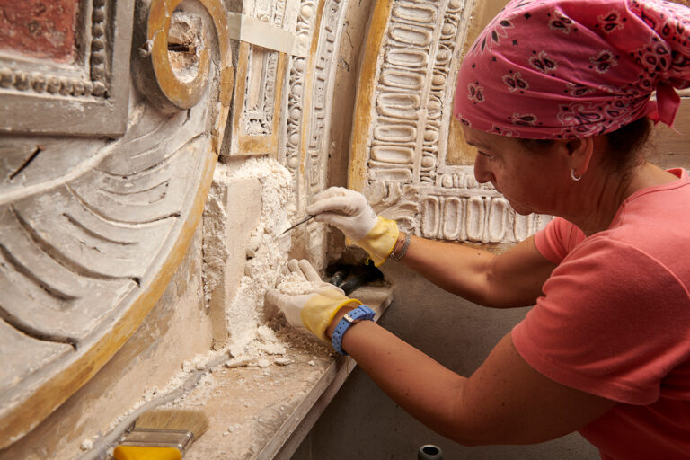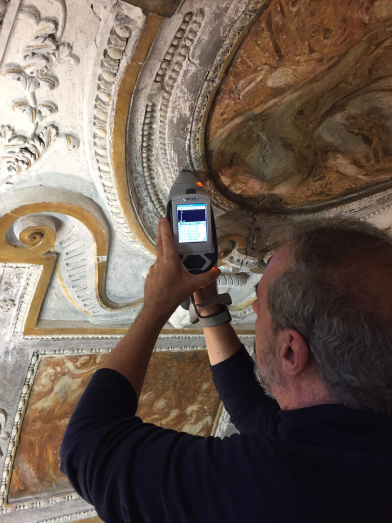 From 2017 to 2018, the Co.New Tech firm primarily concentrated its efforts on the conservation of the stuccowork and frescoes in the vault and lunette. Thanks to stratigraphic studies undertaken using X-ray fluorescence (XRF) technology, traces of the original 16th-century colors of the stucco decoration were identified beneath several layers of overpainting from previous interventions over the centuries. Conservators were able to safely remove these non-original layers, restoring Andrea Schiavone’s original color palette. Schiavone’s frescoes were cleaned, and areas of heavy overpainting were removed, revealing more of the original details and figures. Any cracks or fissures were consolidated and filled, ensuring that the chapel’s decoration is preserved well into the future. The marble elements and sculptures were also cleaned and found to be in good condition.
