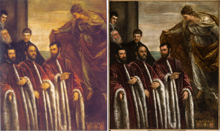 During the restoration, conservators from the COREST firm removed the overpainting that had obscured Saint Justina’s facial features, retouched and consolidated losses, removed the discolored varnish that had obscured the richness of the pigments, and replaced it with a new protective coat of transparent varnish.
