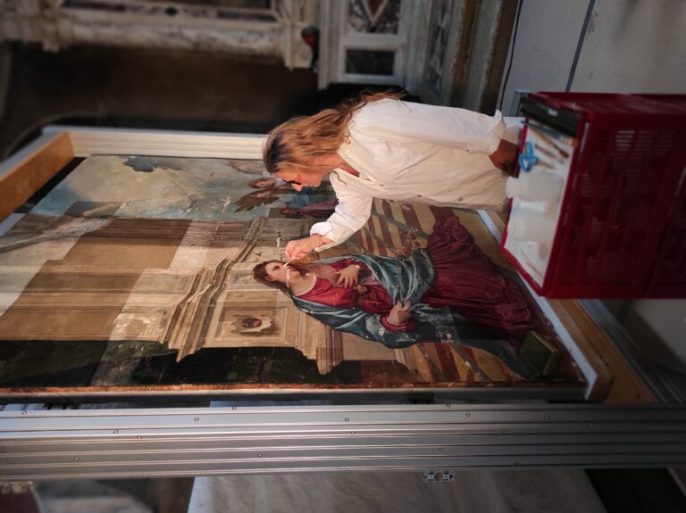 Until recently, the dating of Titian’s Annunciation relied largely on stylistic evidence, fluctuating between 1512 and 1529. The 2021-2022 conservation treatment has led to exciting discoveries. At the bottom of the painting beneath a retouched area, infrared technology revealed the inscription that acknowledged both the patron of the painting, Broccardo Malchiostro, and the artist’s signature and date of 1520: “TITIANVS P[INXIT] MDXX”. Equipped with the promising results of the non-invasive scientific analysis and after consultation with officials from the Ministry of Culture, conservator Francesca Faleschini removed the non-original overpainting to expose the inscription that had been masked for centuries.