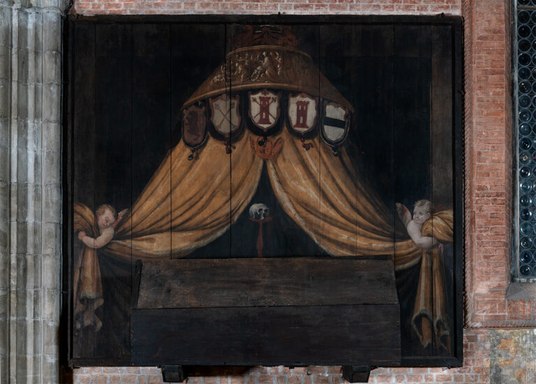 The tomb monument of Count Alvise della Torre, located in the Basilica dei Frari, is quite unlike other funerary monuments of its time. Installed high above the door leading from the right-hand aisle of the church to the cloister, the monument consists of a simple wooden casket and a painting behind it. Recently attributed to Andrea Schiavone by Prof. Patricia Fortini Brown, the painting depicts a pavilion-type canopy with curtains that are held back by two winged putti. Five coats of arms of the della Torre family decorate the canopy; at the center, where the curtains are parted, is a skull that drips blood onto the casket below. Darkened by age, the painting is difficult to make out and goes largely unnoticed amongst the more prominent tombs that line the walls of the church at eye level.
