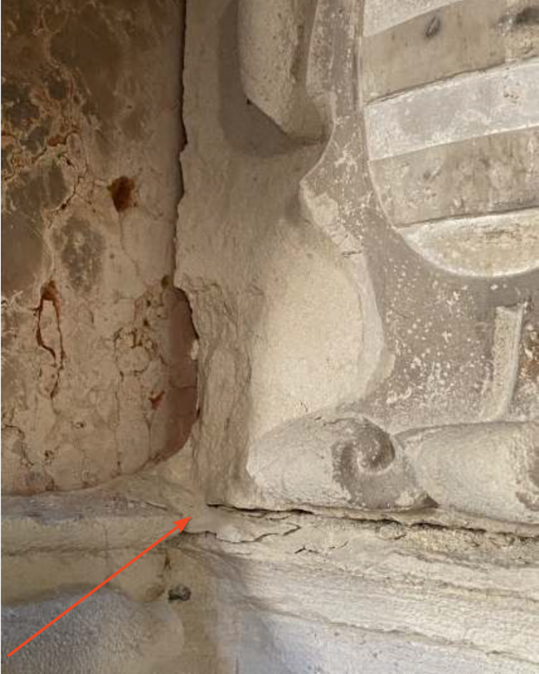 The Verona marble sarcophagus was in a reasonably well-preserved condition, although the surface was greatly obscured by dust and grime, with some signs of deterioration evident in the joint fills between the individual pieces. The two Donato coats of arms, made from a soft carved stone, suffered from the effect of long-term exposure to rising damp due to their proximity to the deteriorating stone portal underneath. Both shields had remnants of gilding and polychrome decoration, possibly dating back to their original creation, and this decoration was obscured by surface grime and lifting and flaking.