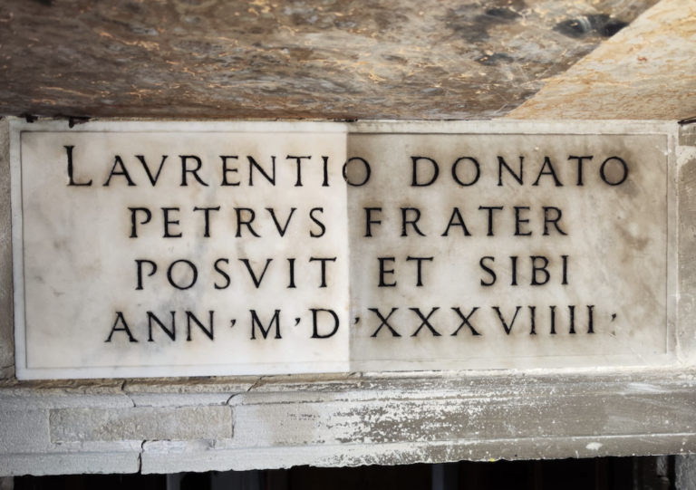 In 1536, Piero bequeathed 25 golden ducats to the friars of San Sebastiano in exchange for his burial within the church. The sarcophagus was installed on the wall in 1539 by Lorenzo and Piero, as documented by the inscription on the marble plaque: “LAURENTIO DONATO / PETRUS FRATER / POSUIT ET SIBI / ANN MD XXXVIIII.”