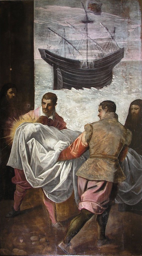 Domenico Tintoretto’s painting of the Transport of the Body of St. Mark shows two courageous Venetians, Rustico da Torcello and Bono da Malamocco, in the act of bringing Saint Mark’s shrouded body to a Venetian ship docked in the harbor of Alexandria.