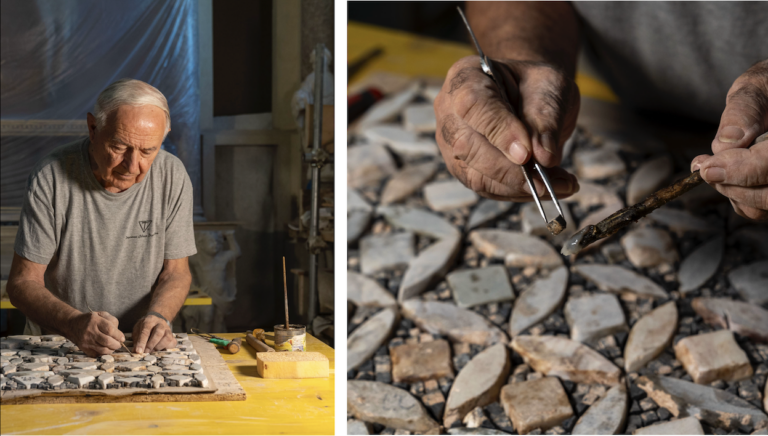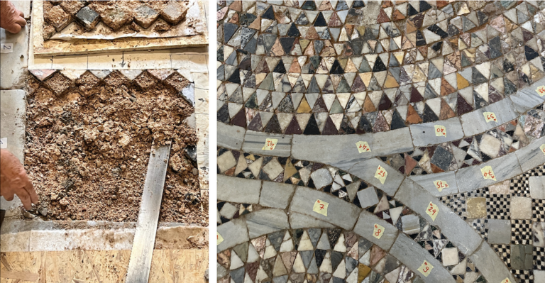 The conservation entails detaching the mosaic floor in sections, removing and replacing the mortar, integrating missing mosaic tesserae, and placing each section on a new base. The detached portions are being treated in a temporary laboratory set up in the closed fourth nave of the church. Once the roof work has been completed in 2025, the restored mosaic segments will be reinstalled in the presbytery, on top of a new subfloor that will be created following mosaic floor building practices defined by Vitruvio in the 1st century.