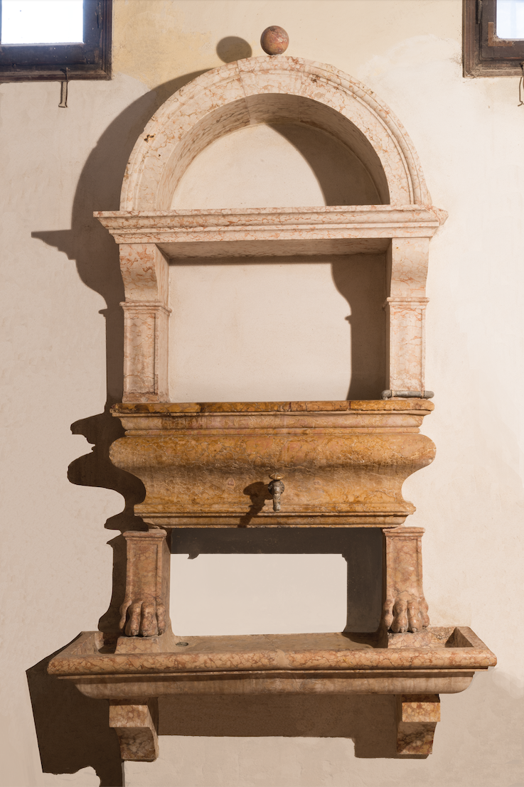 With its elegant and elongated structure composed of multiple stacked elements, this “lavabo da sacrestia” served priests in preparation for mass. The lowest component, a molded-edged basin, is supported by two wall-mounted shelves elevated about thirty centimeters above the ground. Resting atop these are two lion-paw pilasters that uphold a larger basin. Above this, two additional pilasters support an architrave and a full semicircular arch, crowned by a sphere positioned above the keystone.