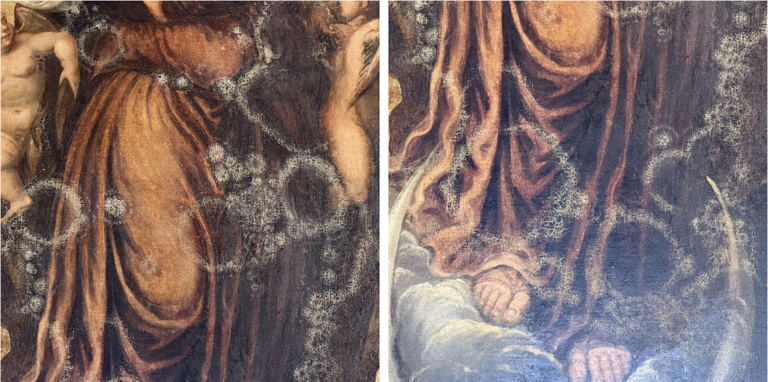 The three canvas paintings show numerous circular white deposits across their painted surfaces, characteristic of fungal or mold activity. The visible deterioration suggests that the biological damage may be even more extensive on the reverse of the canvases, though the precise mechanisms of this degradation remain to be investigated. A more thorough assessment will be carried out during the handling and inspection phases of the restoration process.